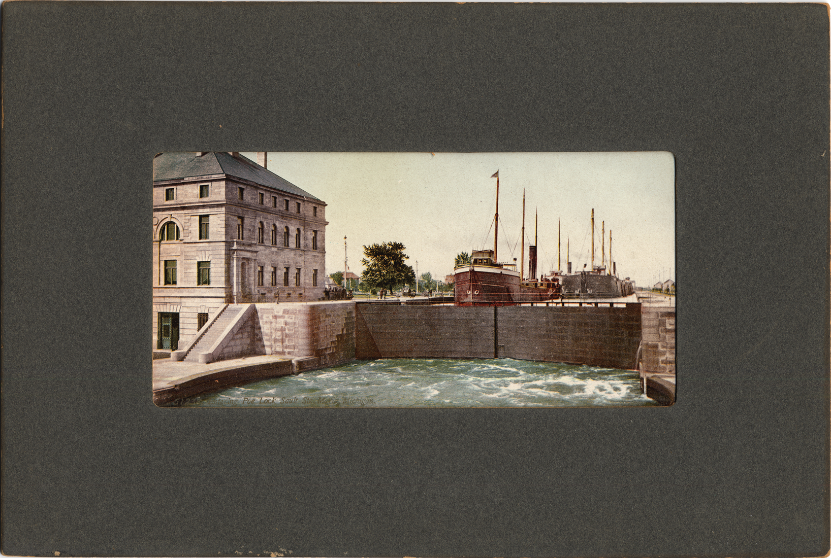 View of the freighter "La Salle" entering Poe Lock at Sault Ste. Marie, Michigan. Printed on front of photo: "51238. Entering Poe Lock, Sault Ste. Marie, Michigan." Printed on photo back: "Aac Photograph, we photograph the world in the colors nature, Detroit Photographic Company, scenic and art publications, Detroit, Michigan."
