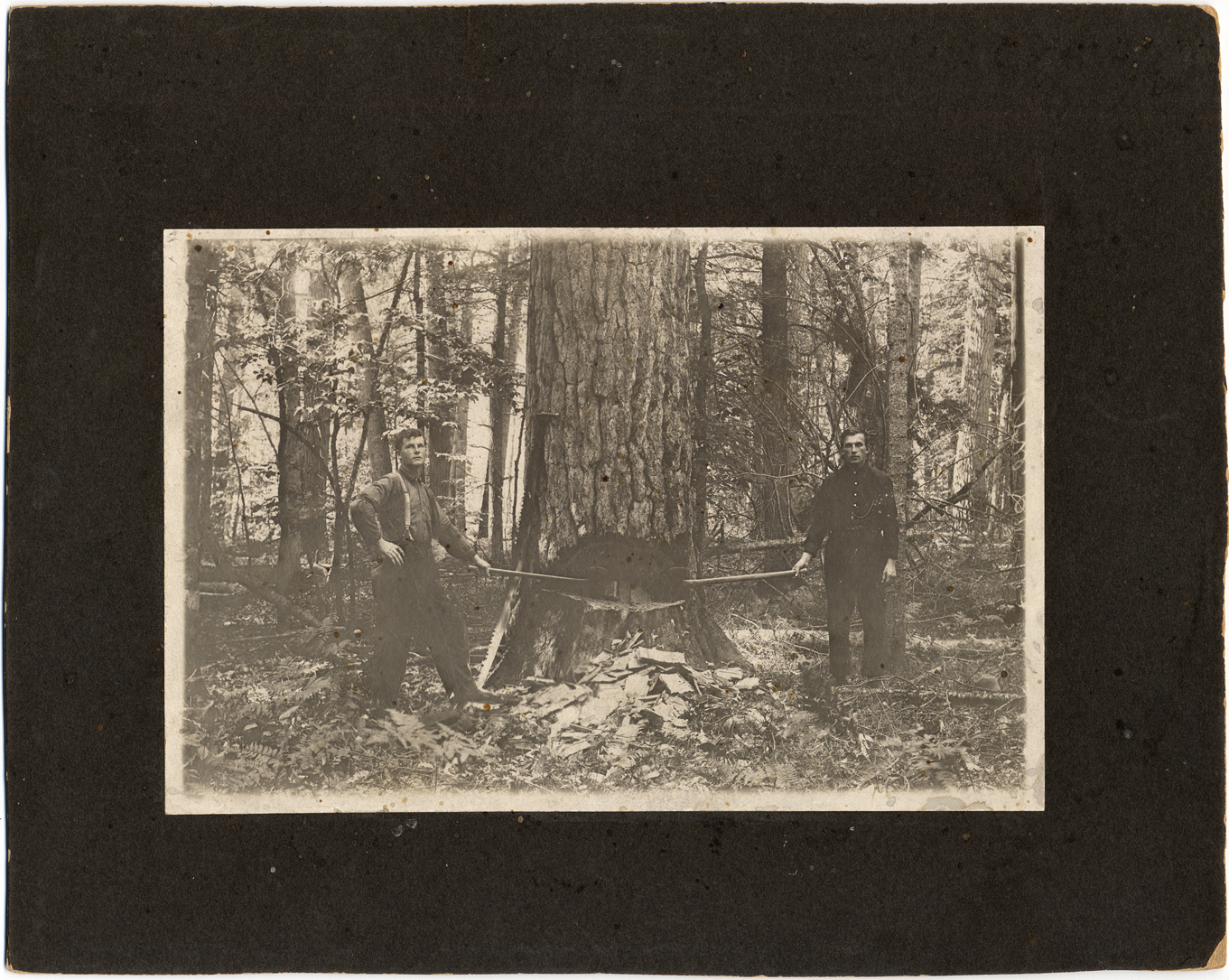 Two men posed with axes and partially-cut tree. Handwritten on mat back: "From Henry Stephens camp, Gaylord, Mich., obtained by Geo. A. Young, Otsego Lake (now of Detroit). Photo taken about 1896."