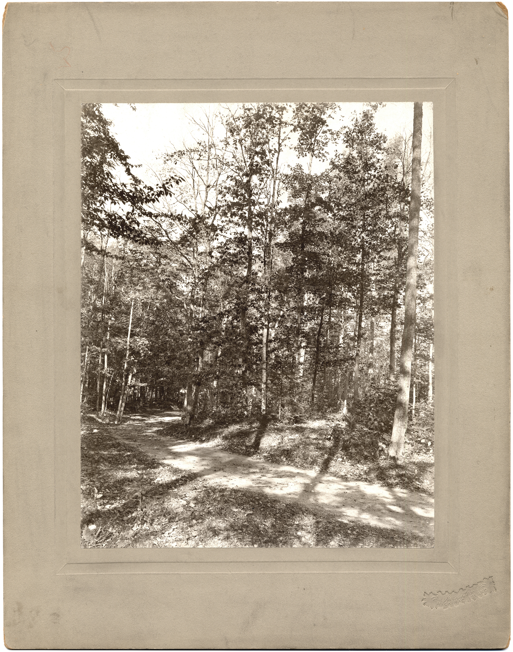 Winding unpaved road through trees. Embossed on mat front: "Rossiter, Mackinac Island." Handwritten on mat back: "Leslie Ave."