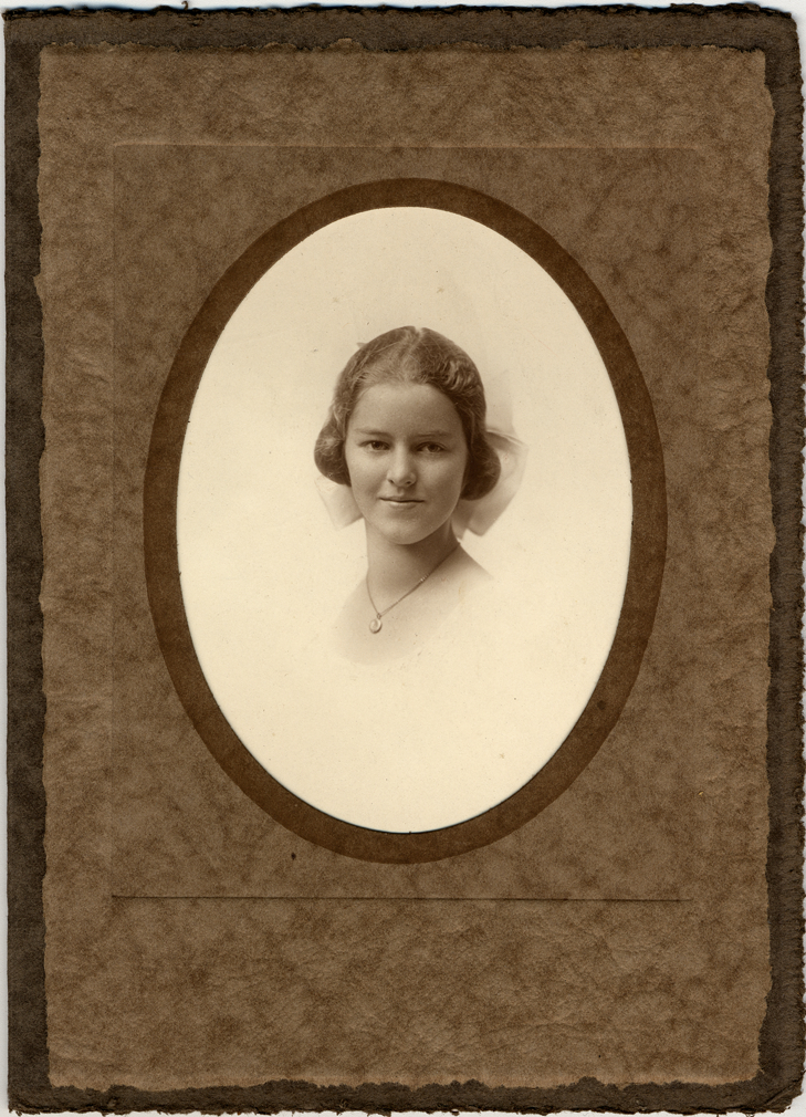 Portrait of a girl with hair pulled back by a big bow, wearing a necklace. Printed on folder front: "Collers, Tecumseh, Mich."