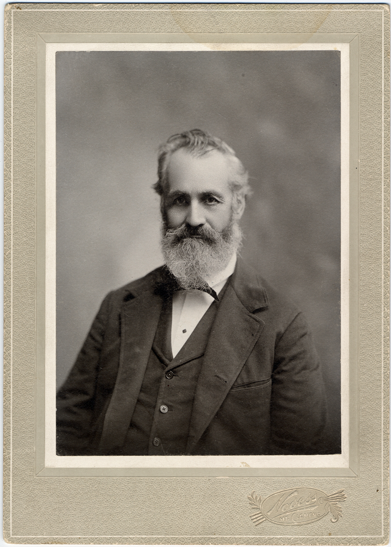 Portrait of a man with graying hair, mustache and beard, wearing a suit jacket, vest, dress shirt and bow tie. Embossed on photo front: "Novess, Mt. Clemens."
