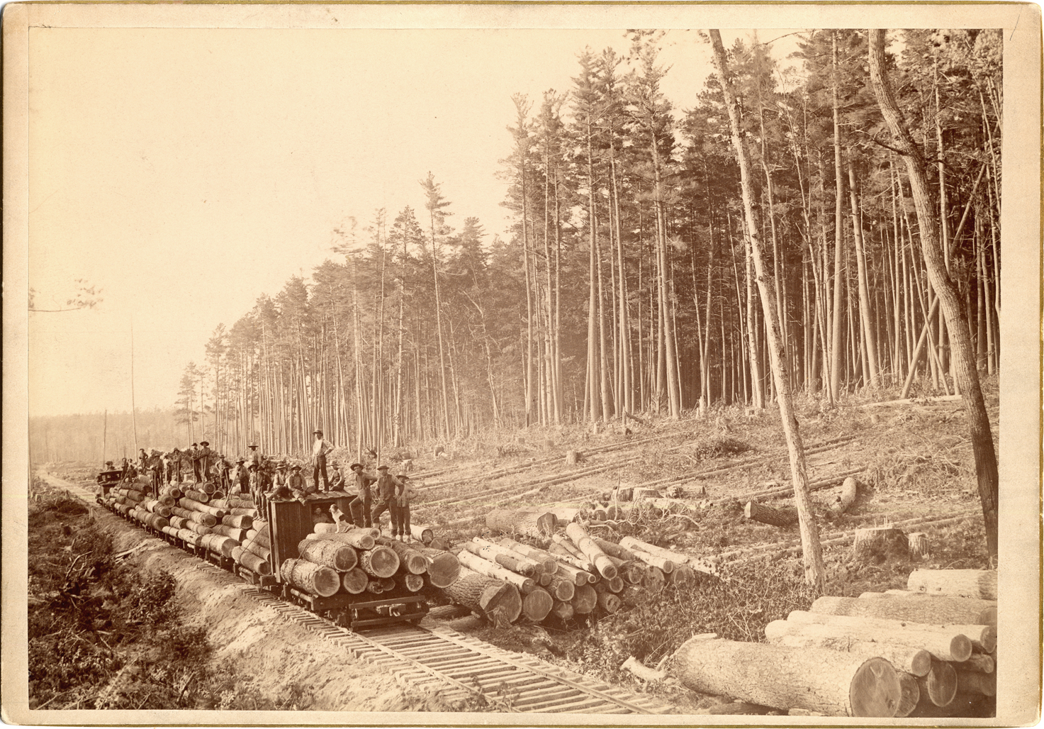 Logs on flatcars, with workmen and dog. Tracks at the bottom of skid from woods. Printed on mat back: "Bonnell, photographer, Grayling, Mich. Groups and views at lowest rates. Negatives kept for future orders. Duplicates can be had at any time." Handwritten on mat back: "About 1880, Henry Stephens logging, 38.78.2."
