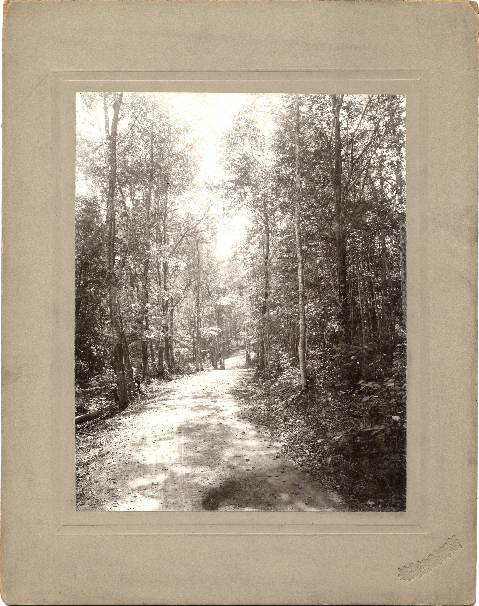 Winding unpaved road through trees. Embossed on mat front: "Rossiter, Mackinac Island."