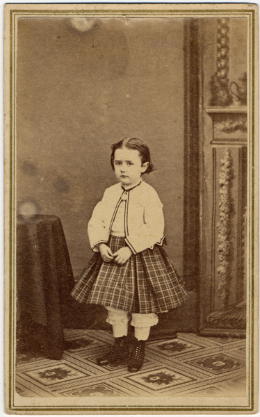Portrait of a young girl standing, hands in front, on patterned linoleum floor next to a table, wearing a full, plaid skirt, and jacket with scalloped edge, pantaloons and high-topped shoes. Printed on photo back: "I.N. Hall, photographer, Exchange Block, Ann Arbor ... and see porcelain pictures. Prizes awarded to I.N. Hall at Washtenaw County Fair, 1867... Dr. Chase's Steam Print.]"