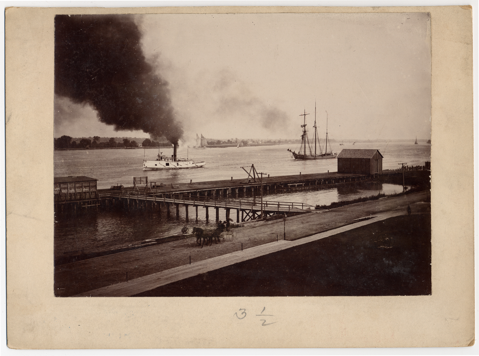 View of a tugboat towing a schooner. Docks and horse-drawn carriage in foreground. Handwritten on mat back: "Passing to Oakland House, St. Clair Springs, Westrick."