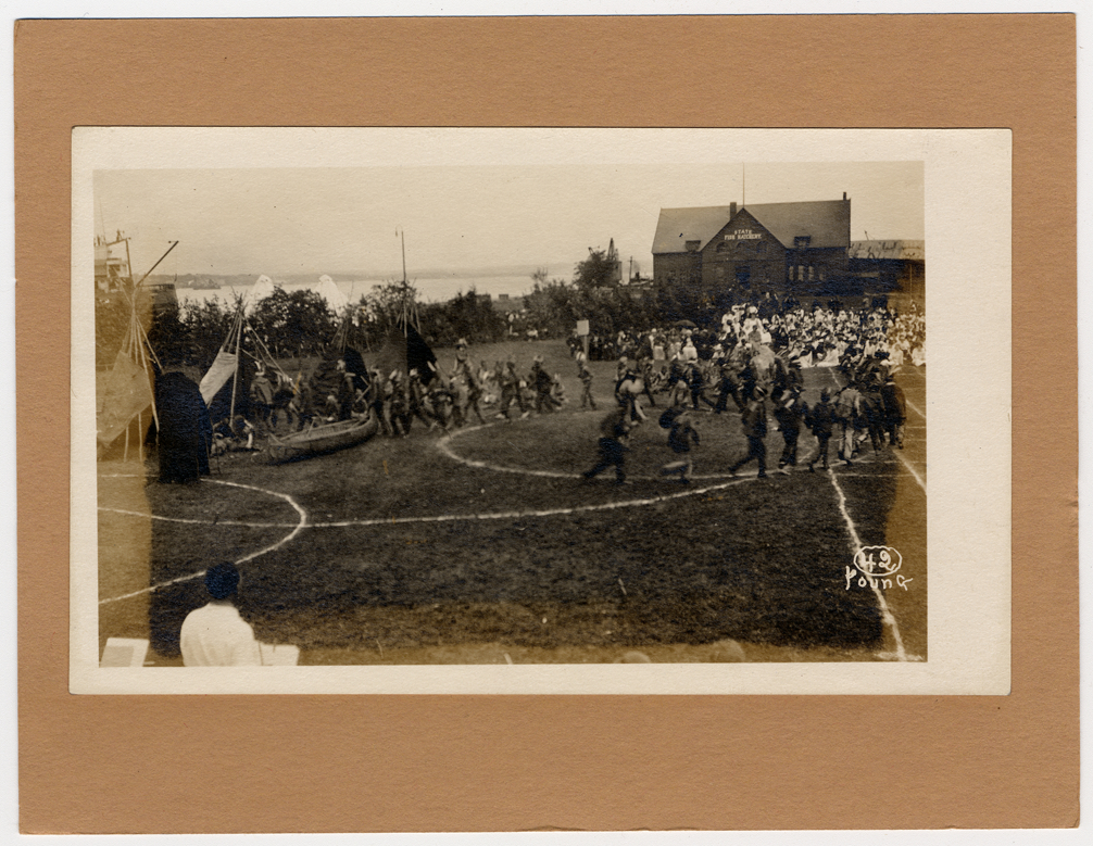Performers costumed as Indians, near three tipis and canoe. Audience on opposite side of field, with State Fish Hatchery building behind. Handwritten on photograph front: "Young" with number 42. Handwritten on mat back: "View of the historical pageant celebrating the anniversary of the treaty made at Sault Ste. Marie between Gov. Lewis Cass and the Indians, June 15, 1820. Sault Ste. Marie, Mich, 1920."