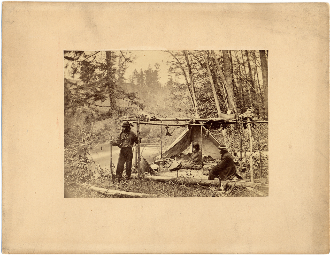 Three people in front of tent above the riverbank. One man standing, two people sitting. Meat on drying rack over fire. Handwritten on mat back: "Indian camp on Sable River, Mich."