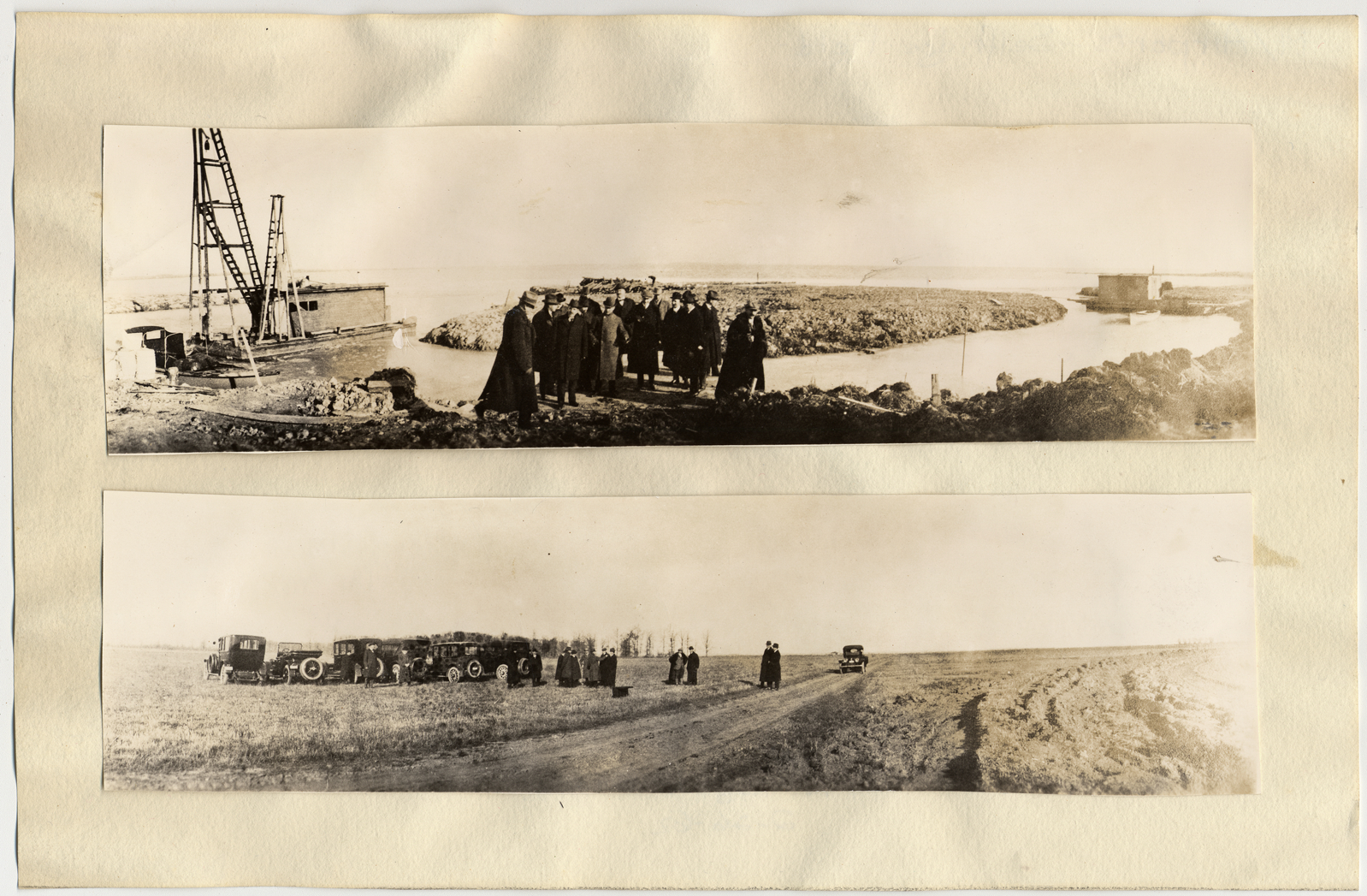Two photographs on stock paper. Lower photo shows men and automobiles in an open field. Written on photo back: "The beginning of Selfridge Field."