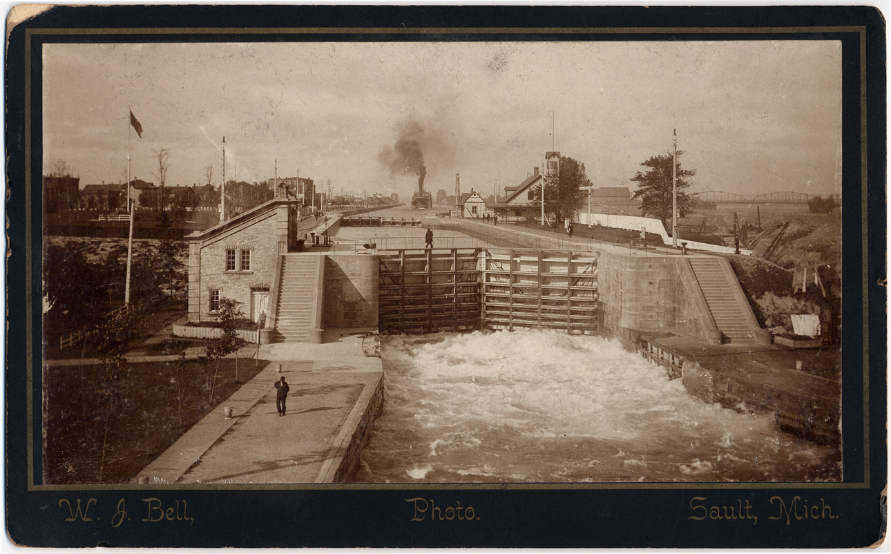 Overhead view of lock opening; man walking on top of gate. Large ship approaching in far background. Town in background, including International Bridge. Printed on front: "W.J. Bell, photo, Sault, Mich." Printed on back: "W.J. Bell, landscape and portrait photographer, the leading city artist, proprietor Bay City and Elite Studios, 67 & 13 1/2 Portage Ave. Sault Ste. Marie, Box 386, correspondance solicited." Includes long list of photographs available from studio: "Interior of locks--empty," "Vessels entering Locks from below, bound up," etc.
