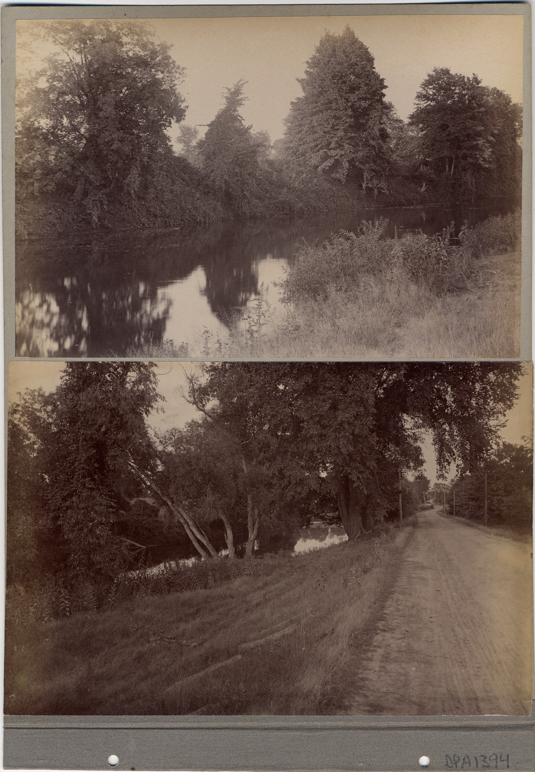 Reflecting pond in parkland. Mixed deciduous trees. Unpaved road in lower photograph. Handwritten on mat back: "Lodge Estate." Mat slightly warped; holes drilled for mounting in book.