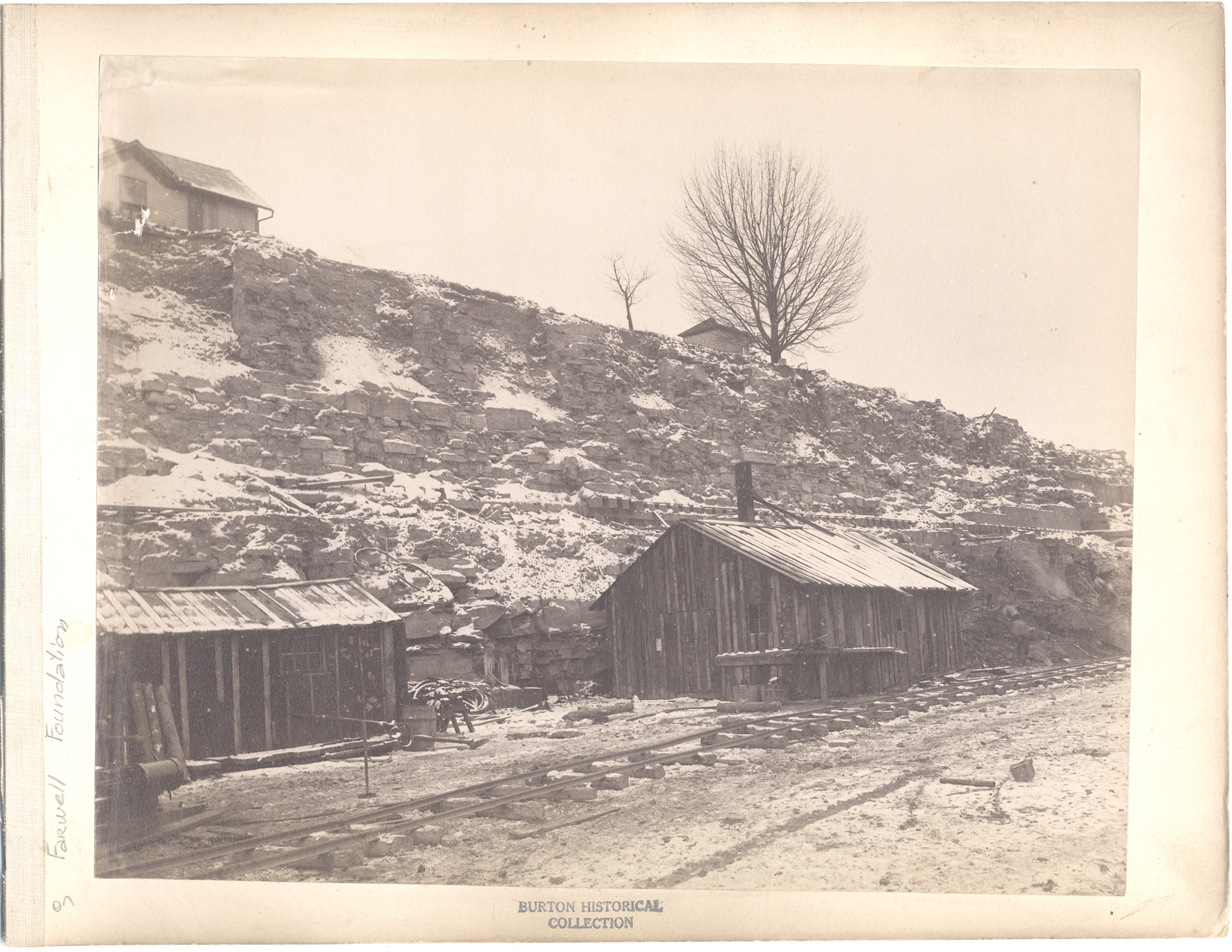 Construction site of St. Mary's Falls Canal lock pit showing railroad tracks and buildings. Scattering of snow.