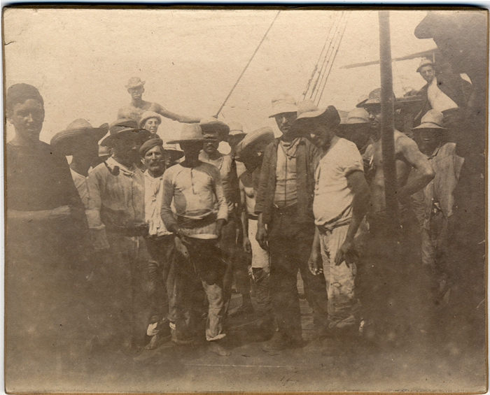 Group of men in civilian clothes on board ship. Handwritten on duplicate mat back: "E.B. Nall."