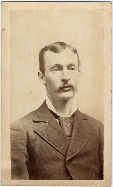 Portrait of a man with a mustache, wearing a plaid coat and patterned tie. Printed on photo back: "N.C. Skinner, photographer, in Mallery's Block, Reading, Mich. Enlarging old pictures is a specialty."