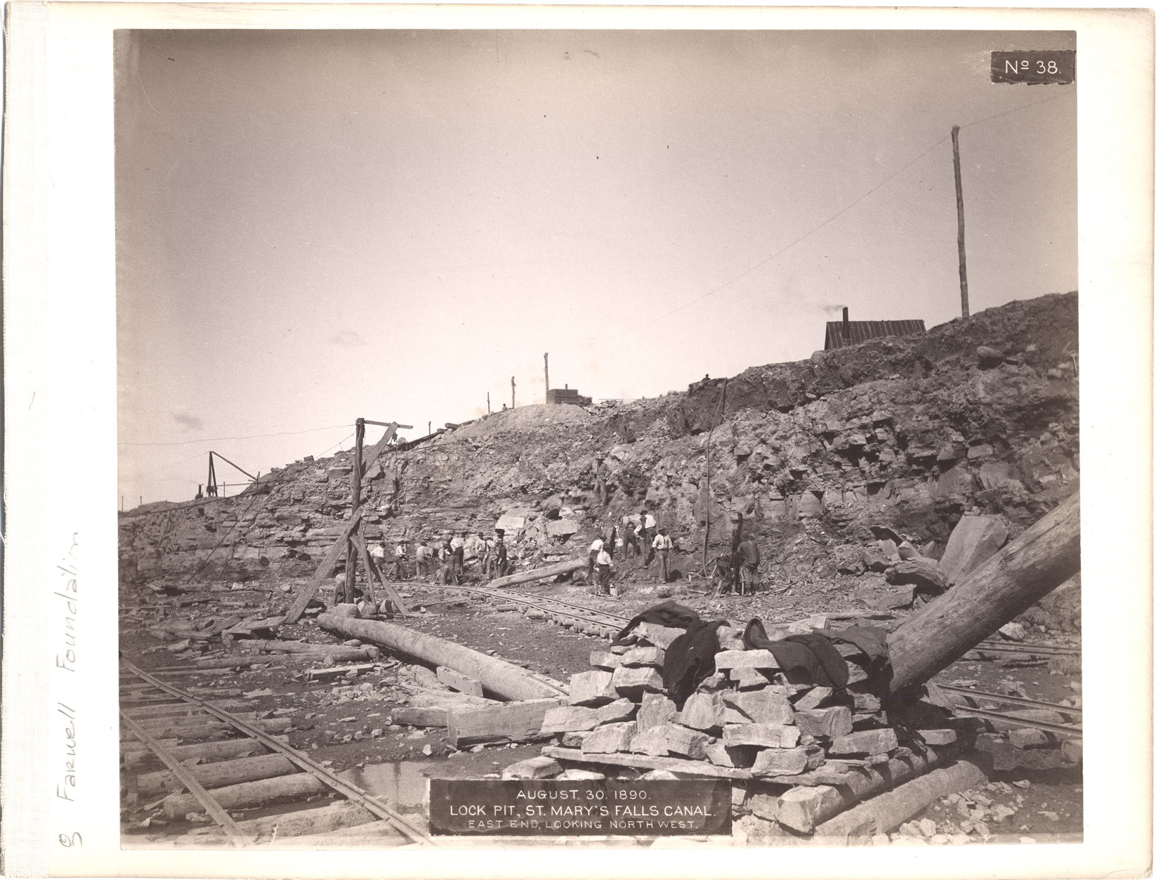 Construction site of St. Mary's Falls Canal lock pit showing railroad tracks, machinery, and workmen. Buildings and utility poles on above pit. Printed on front of photo: "No. 38, August 30, 1890, lock pit, St. Mary's Fall Canal, east end, looking north west."