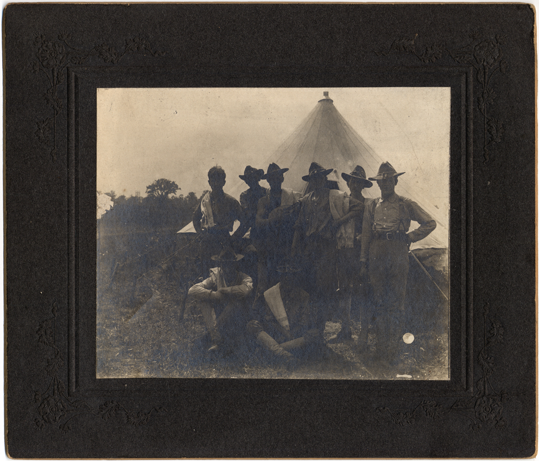 Dark picture of men in front of conical tent. Handwritten on mat back: "Nat Guard. Standing, left to right - Tom Burdeno, Geo. Herrman, [unknown], 'Dauber' Davis, [unknown], [unknown]. Sitting - Jim Rooney, Geo. Jobin."