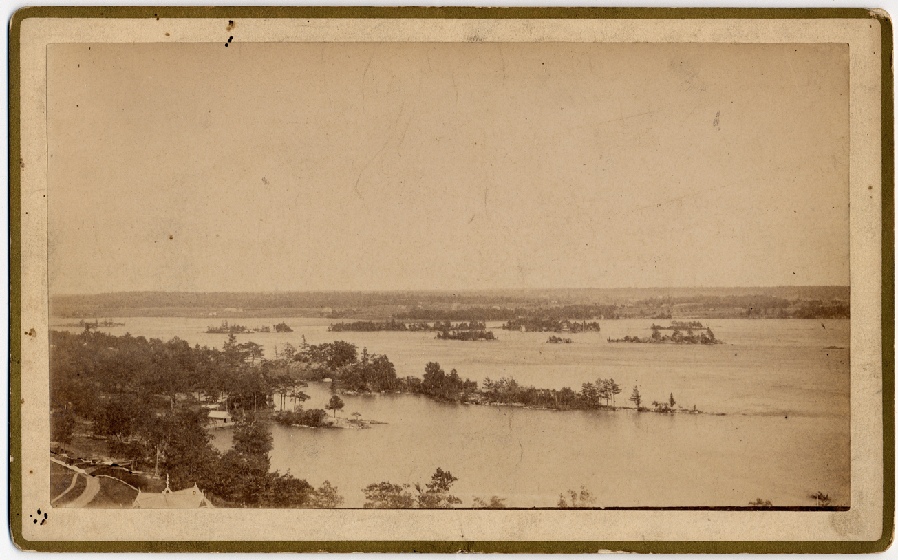 Islands in St. Clair Flats viewed from the air. Handwritten on cabinet card back: "South east from T.J.[?] Park."