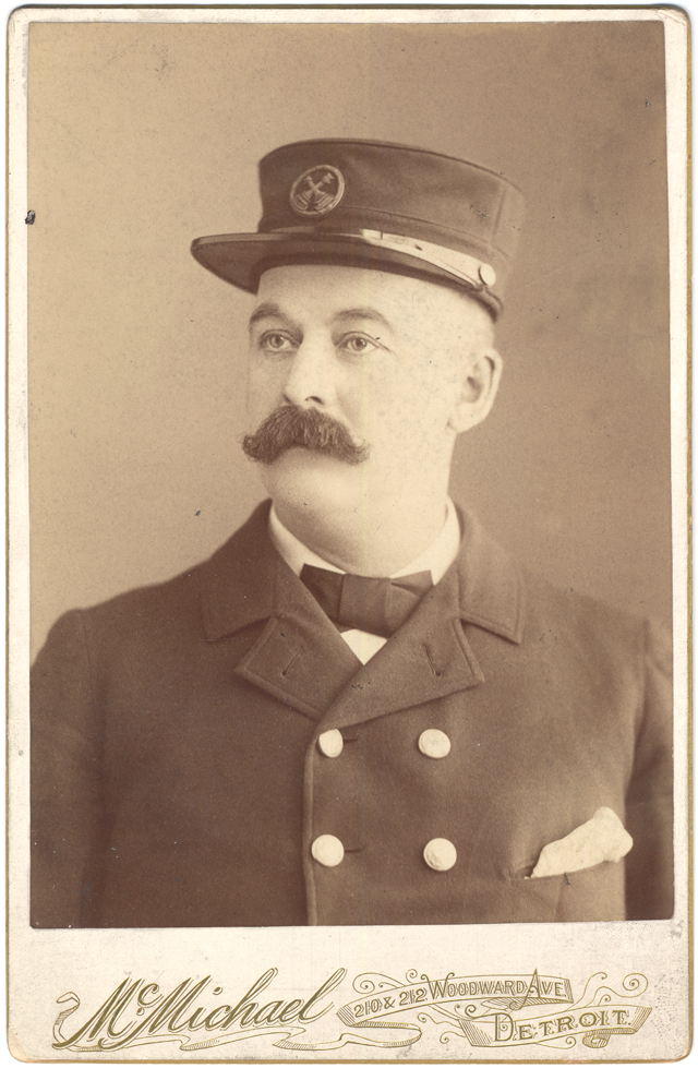 Moustached man posed in studio in Fire Department uniform. Printed on card front: "McMichael, 210 & 212 Woodward Ave., Detroit." Printed on card back: "McMichael's photographic studio, Detroit, Mich. Duplicates and enlargements can be obtained at any time." Handwritten on card back: "A. Armstrong, December 1890. Supt. of horses." 1890 Detroit City Directory gives name as Allan Armstrong, superintendent of horses for Fire Department.