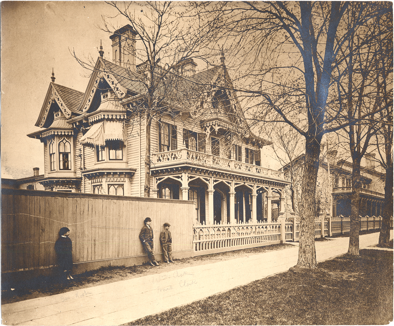 Large clapboard house with gingerbread trim, viewed diagonally across board sidewalk and fences (decorative and utilitarian). Three boys lean on board fence. Leafless trees by sidewalk, more houses beyond. Handwritten on photograph front, under boys: "George Root, Wm. Clark, Frank Clark." Typed on label on photograph back: "This house was erected about 1857 or 1858, for Dr. Augur Clark. The three boys in the foreground are William and Frank Clark, and George Root. The two Clark boys are the sons of the doctor. Mr. James F. Joy lived in the house at one time, and James Joy was born there. It was torn down many years ago, and a row of brick buildings erected in its place. The picture was given me by Mr. William A. Butler Jr. The house is on the north side of Fort Street between Cass and First Streets." Handwritten on photograph back: "D/Sts_Fort, between Cass & First. C.M.B. (?) Dec. 5, 1908."