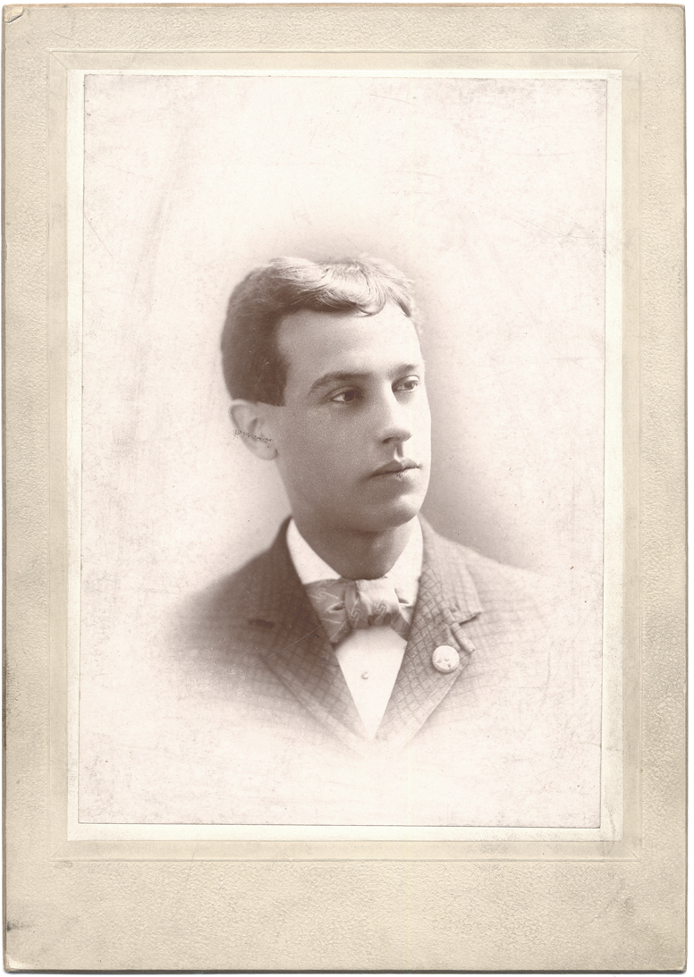 Frederick J. Bussey posed in studio wearing checked suit, bow tie, and pin on lapel. Handwritten on card back: "F.J. Bussey. Killed at Keenan & Jahn Fire, Oct. 5, 1894. Folder 1."
