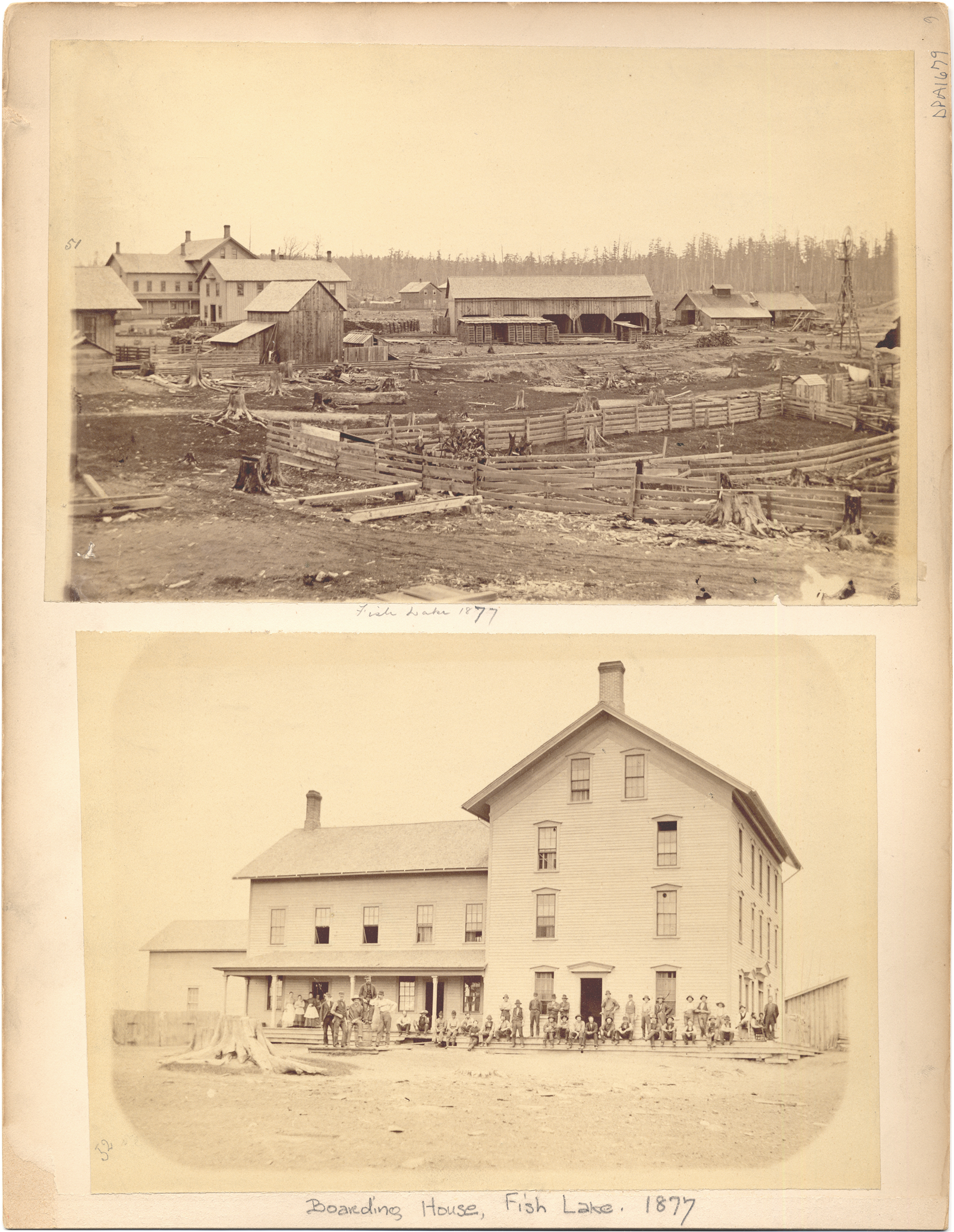 Top picture shows buildings and fences, with scattered stumps. Handwritten on mat front: "Fish Lake, 1877." Lower picture shows large group of people on steps of boardinghouse with stump in foreground. Handwritten on mat front: "Boarding house, Fish Lake, 1877."