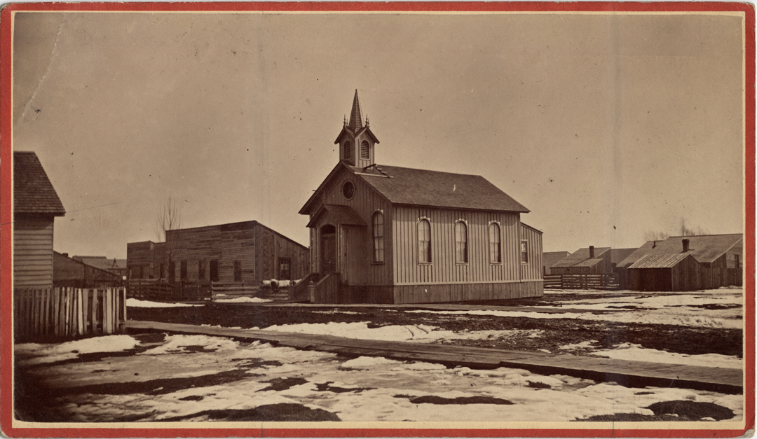 Small paneled church with protruding entranceway. Small belltower and spire on top. Residential neighborhood in background, snow on ground. Handwritten on back: "Formerly Scandinavian Lutheran Church. Located between St. Antoine and Hastings, 1882."