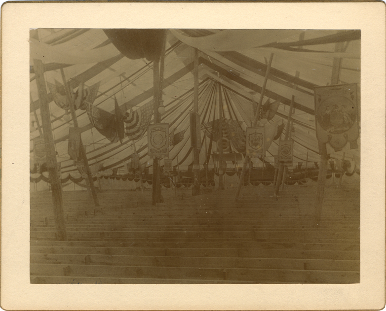 Interior of empty tent set up for revival meeting for teenagers. Hanging banners. Handwritten on mat back: "Interior 'Tent Williston.' Place of meeting for C.E. Convention, July 5-10, 1899. 1."