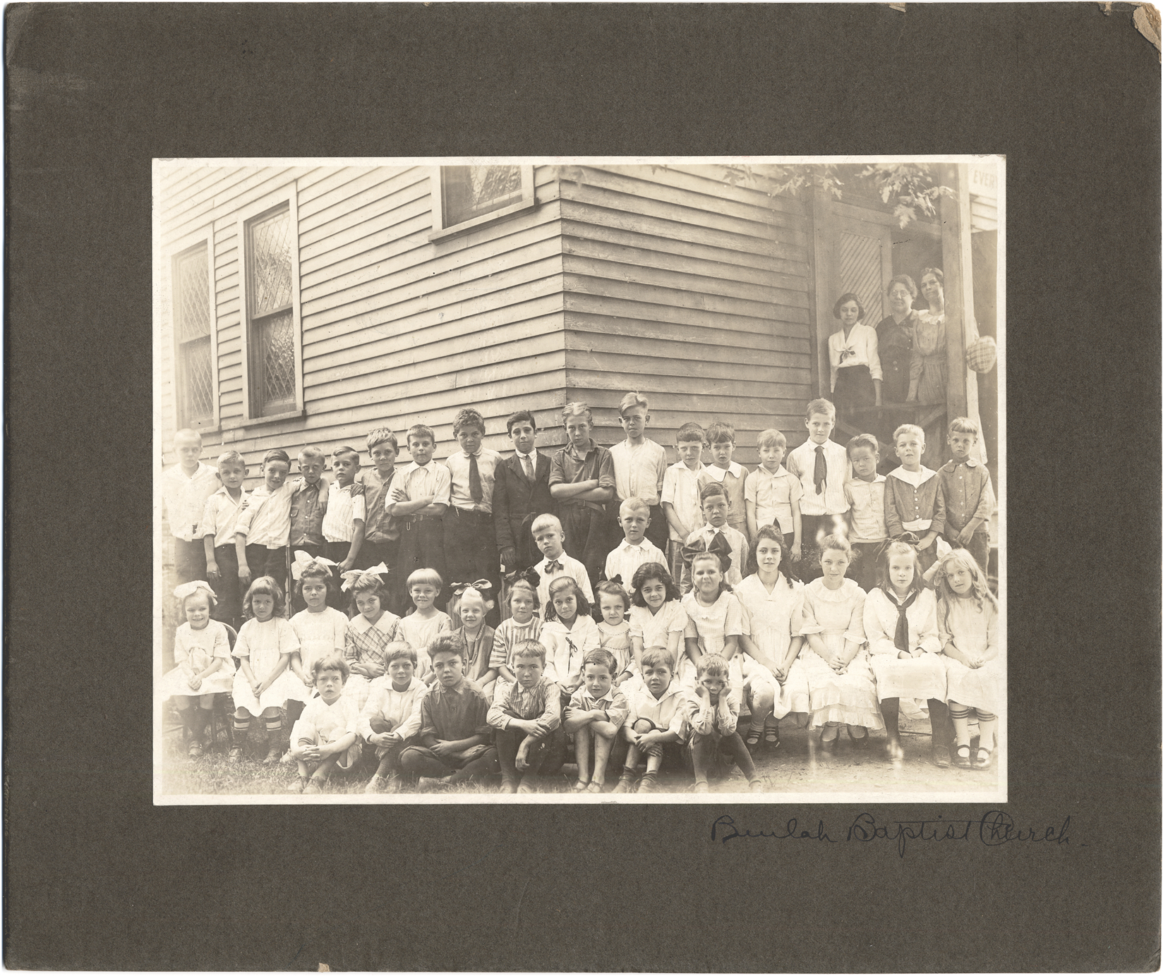 Large group of school-aged children posing in front of church building. Large range of ages. Older boys stand in back row; girls, mostly clothed in white dresses, seated below them; youngest boys seated in front. Three women, presumably teachers, stand on porch of building. Handwritten on front: "Beulah Baptist Church."
