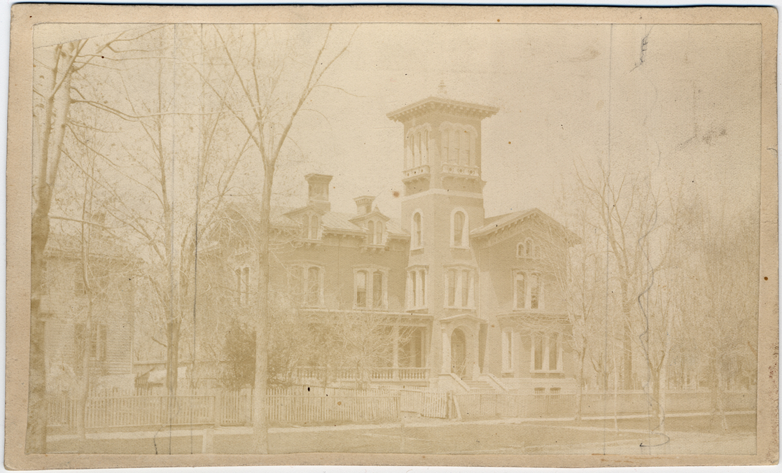 Three-story brick Italianate house with tall square cupola, the residence of John J. Bagley. Handwritten on back: "John Judson Bagley, 1832-1881, cor. 113 Washington Ave. and Park St., 1881."