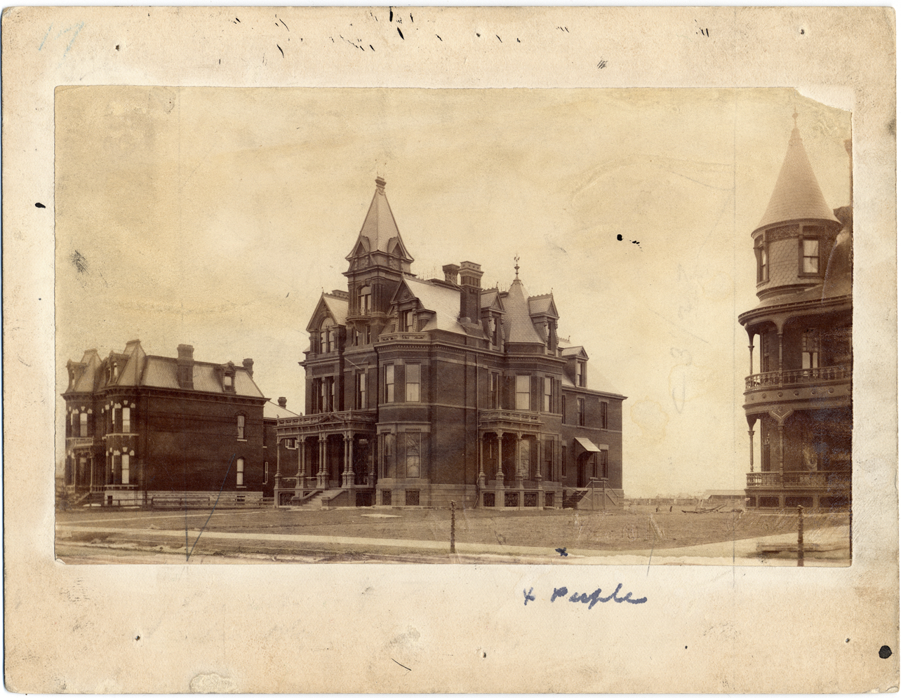 Three-story house with Queen Anne architecture. Pillared entranceway and front porch. Tower in front of building, rounded tower towards back of house. Similar houses on each side. Handwritten on back: "1073 Woodward, 1883."