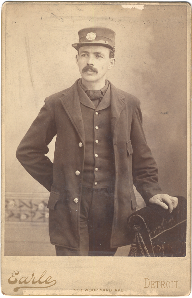 Jacob Van Coeverden posed in studio wearing fire department uniform. Printed on card front: "Earle, 253 Woodward Ave., Detroit." Handwritten on card back: "Jake Vancoeverden, Det. Fire Dept. Folder 2."
