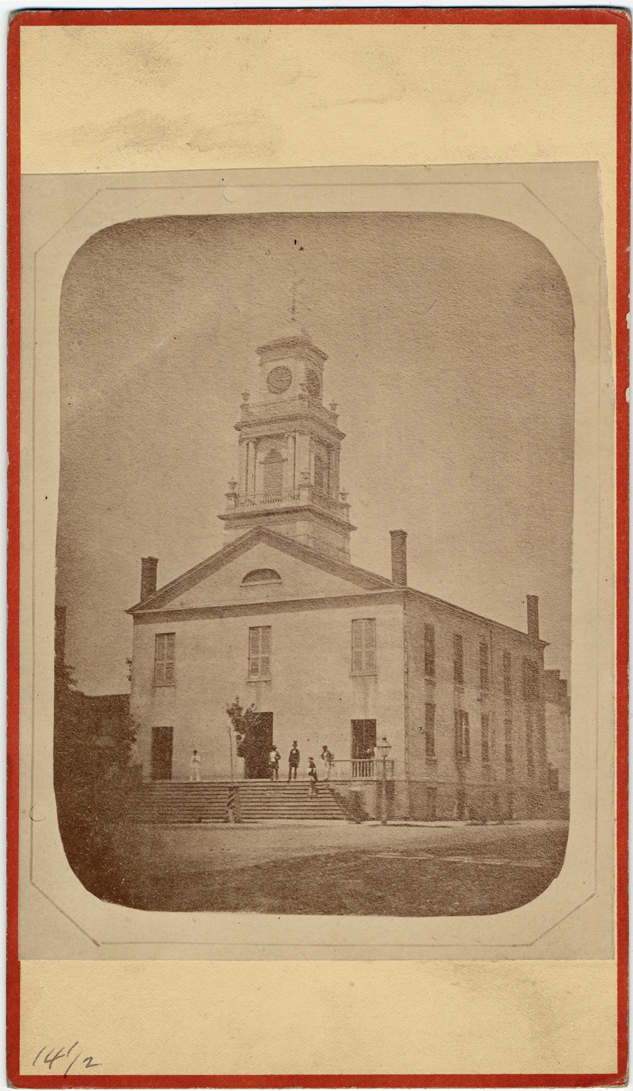 Large white church building; bell tower with clock at top; plain windows with horizontal blinds. Group of people gathered on steps in front, including man in top hat. Handwritten on back: "Original First Baptist Church, N.W. cor. Fort and Griswold, 1858."