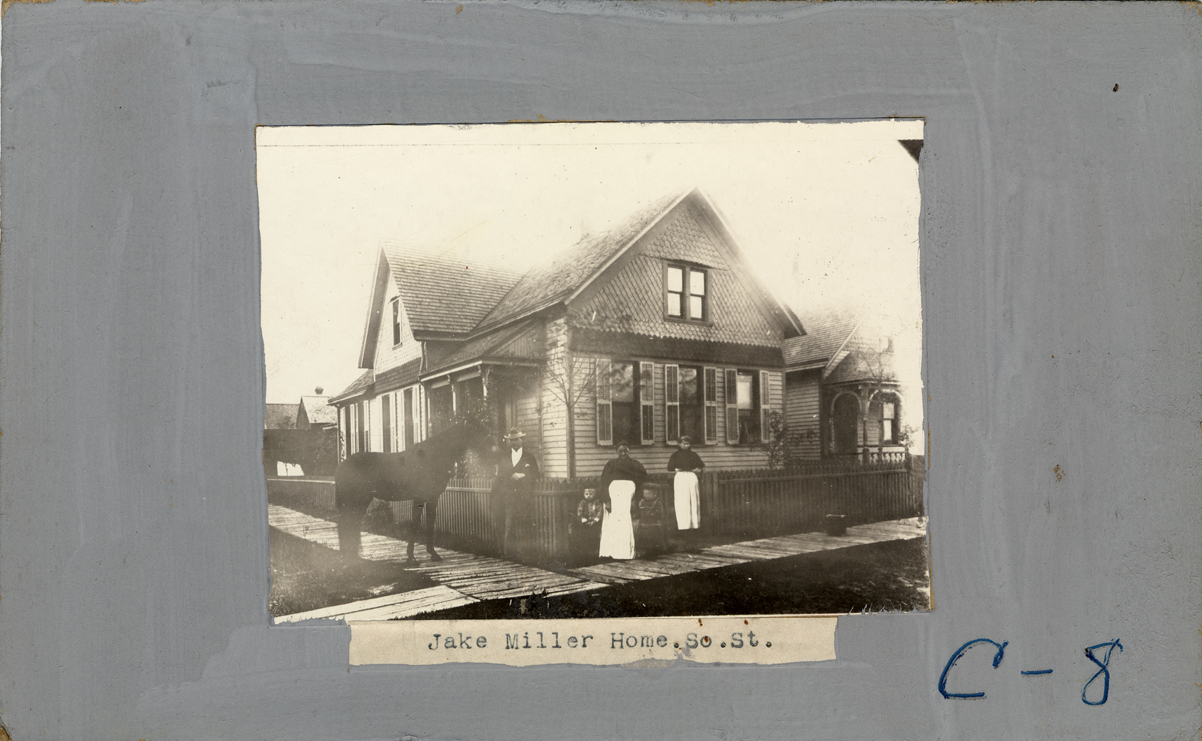 Small clapboard house, side porch. Family and horse stand on wooden sidewalk in foreground. Label on front: "Jake Miller home, So. St."