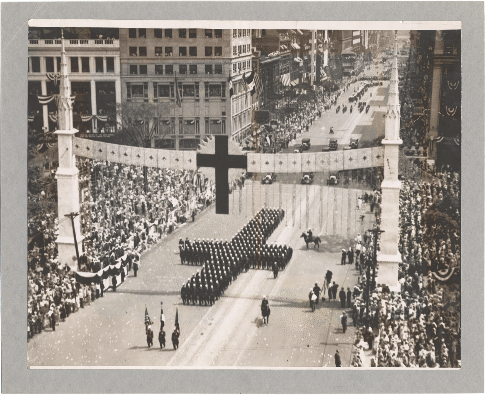 View from a height up parade route, with large crowds of spectators. Banners across road with large central cross. Group in center of frame marching in cross formation. Other images in series have date July 1928.