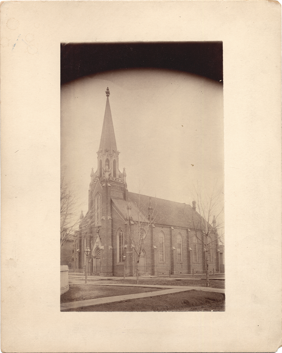 St. Paul's Lutheran (German) Church, located on Seventeenth St. near Michigan Ave. Brick church with Gothic-style windows and tall spire.