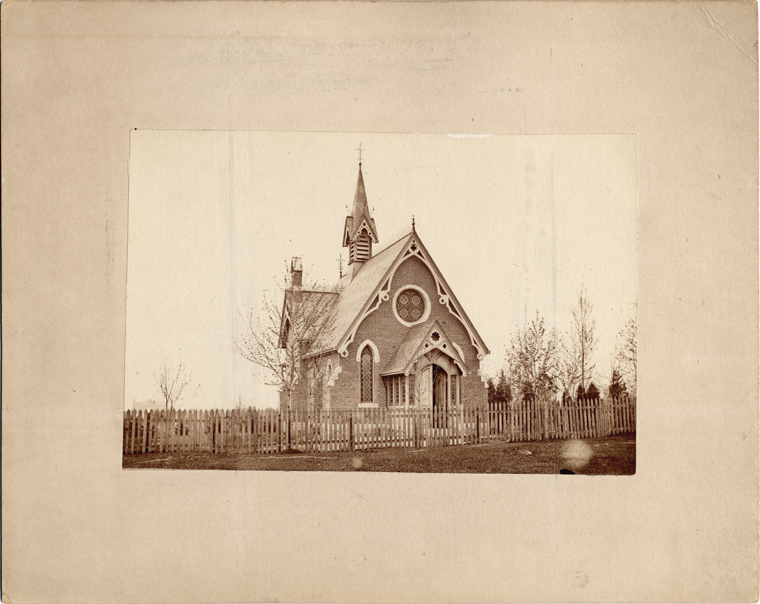 Small brick church with ornate woodwork. Small steeple with cross on top. Stained glass windows. Rural setting, surrounded by wooden fence. Handwritten on back: "St. Luke's Memorial Protestant Episcopal Chapel, 1881, grounds of St. Luke's Hospital, Fort S.W."