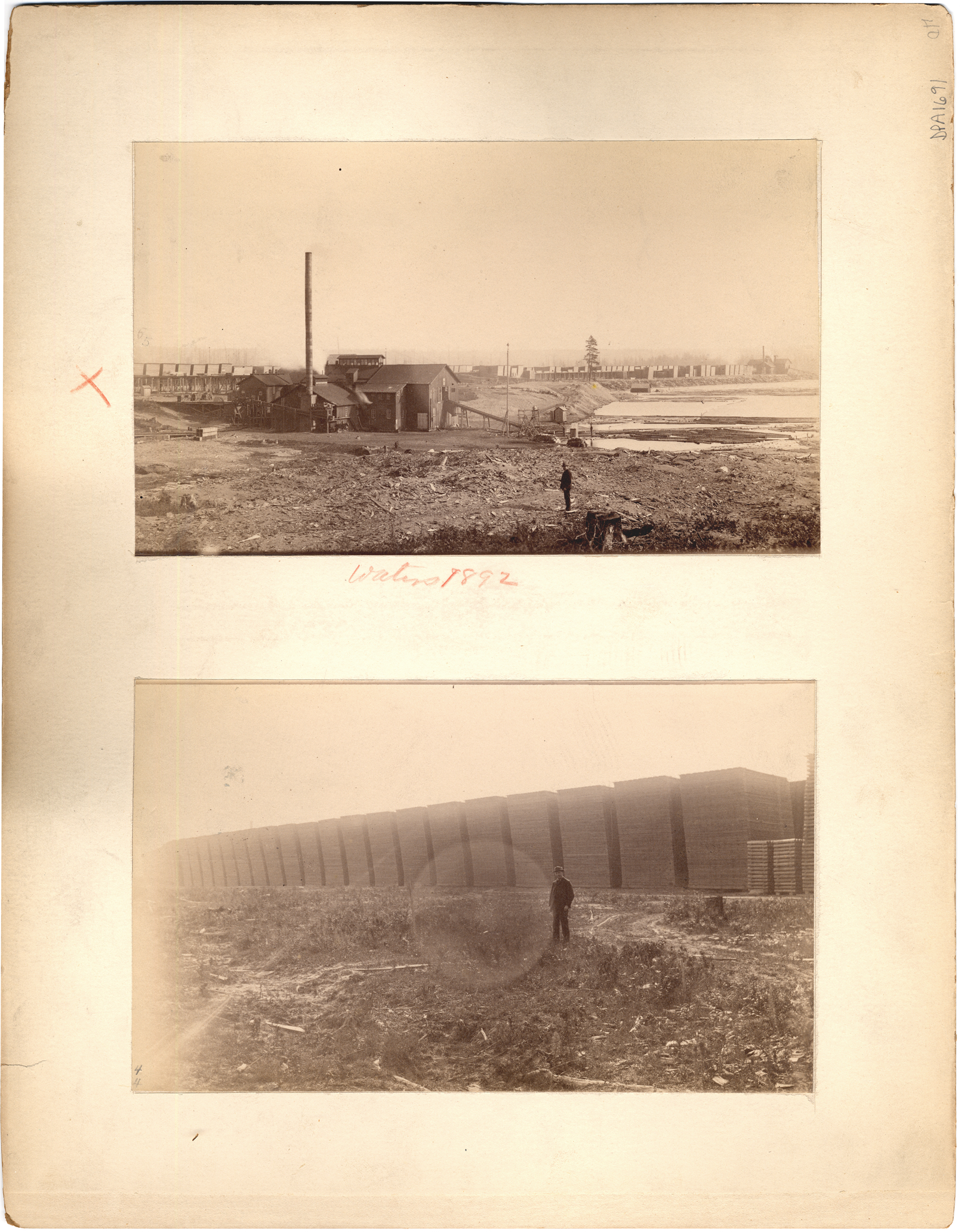 Top picture shows sawmill with lumberyard behind. Ramp leading to floating logs. Man stands alone in foreground. Handwritten on mat front: "Waters 1892." Lower picture shows man standing in front of stacked boards.