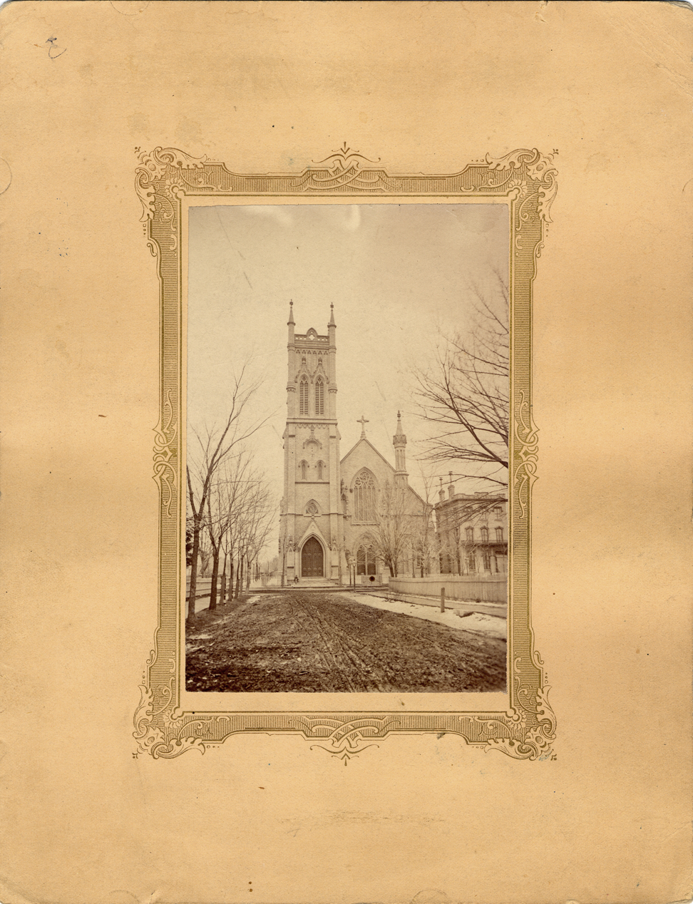 View down unpaved road or drive to entrance to church with Norman bell tower. Picket fence and leafless trees along this road and Woodward. Italianate house next to church. Printed on mat back, partially obscured by typed label: "Photographic sketches, in and about the city of Detroit. Consisting of street and marine views, public buildings, churches, monumental and other objects of interest. Photographed and published by Jex Bardwell." Typed on label on mat back: "St. John's Protestant Episcopal Church, Woodward Avenue and High Street, in 1881." Handwritten on mat back: "St. Johns Protestant Epis. Church, 1881. Woodward & High."