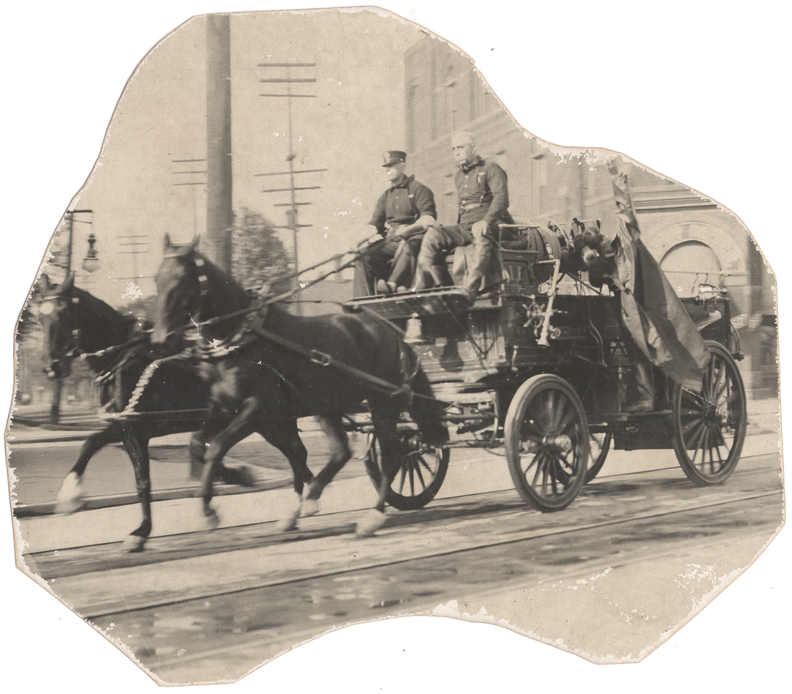 Two men in uniform drive horse-drawn fire engine on broad city street. Photograph cut into irregular shape. Handwritten on photograph back: "Folder 3."