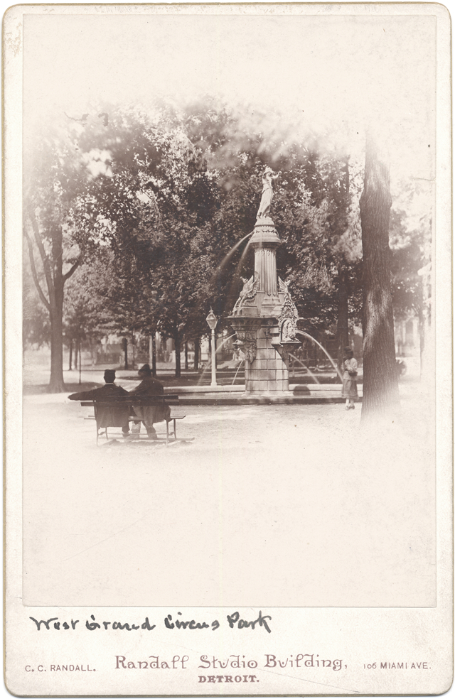 View of fountain in front of trees. Grecian-style figure on top of column. Two men on bench, and girl standing by fountain. Printed on card front: "C.C. Randall, Randall Studio Building, 106 Miami Ave., Detroit." Handwritten on card front: "West Grand Circus Park."