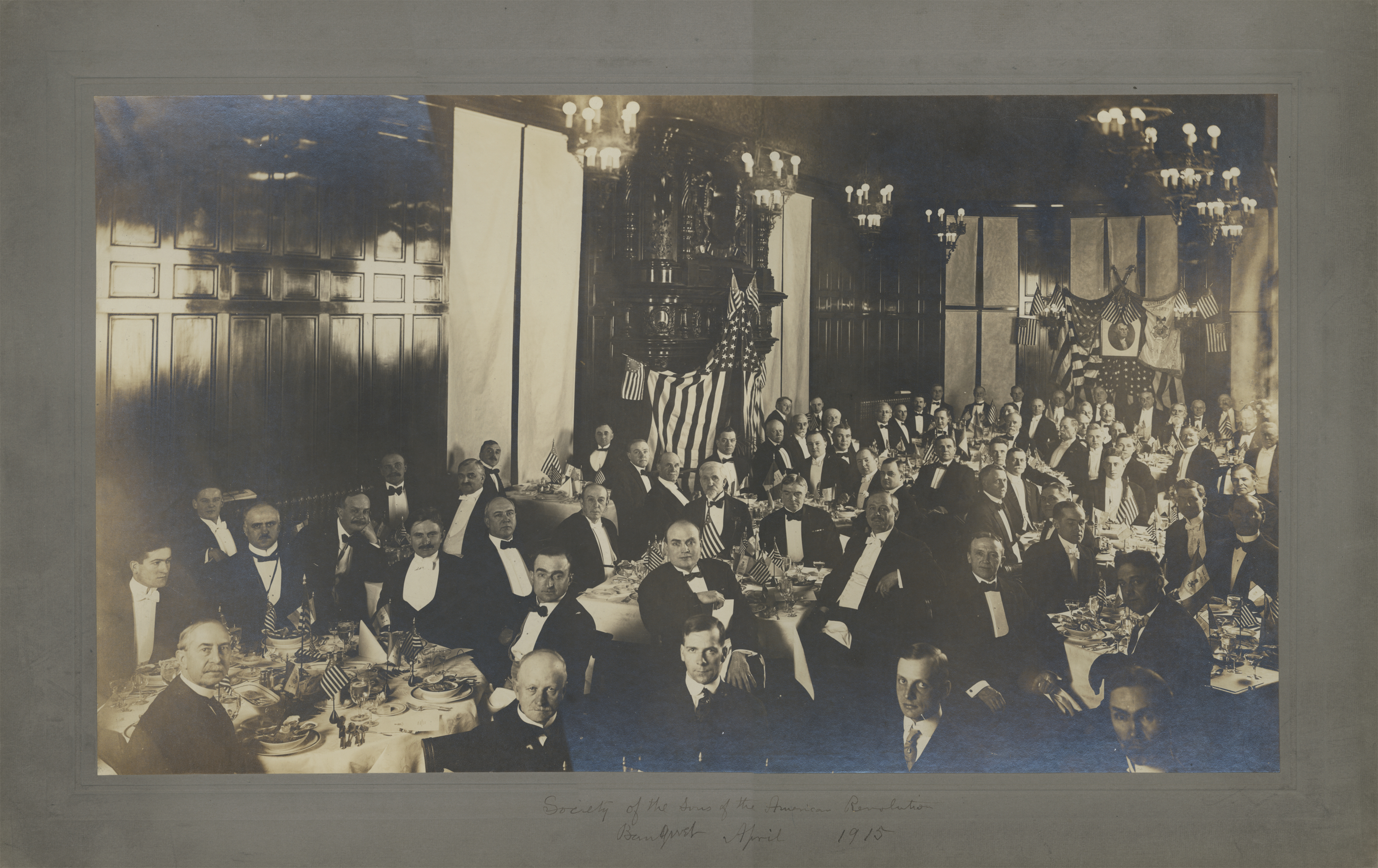 Men in evening dress at round tables in paneled hall decorated with U.S. flags, portrait of George Washington, and Michigan Society banner. Handwritten on mat front: "Society of the Sons of the American Revolution banquet, April, 1915."