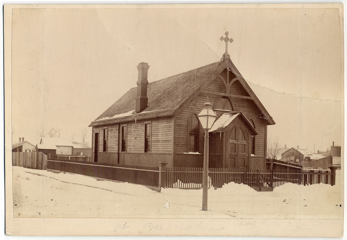 Clapboard church behind picket fence with houses behind. Snow on ground and some on roof; lamppost in center foreground. Handwitten note on mat back partly obscured by label: "[?]ion, 1883, [?] Kenridge St."