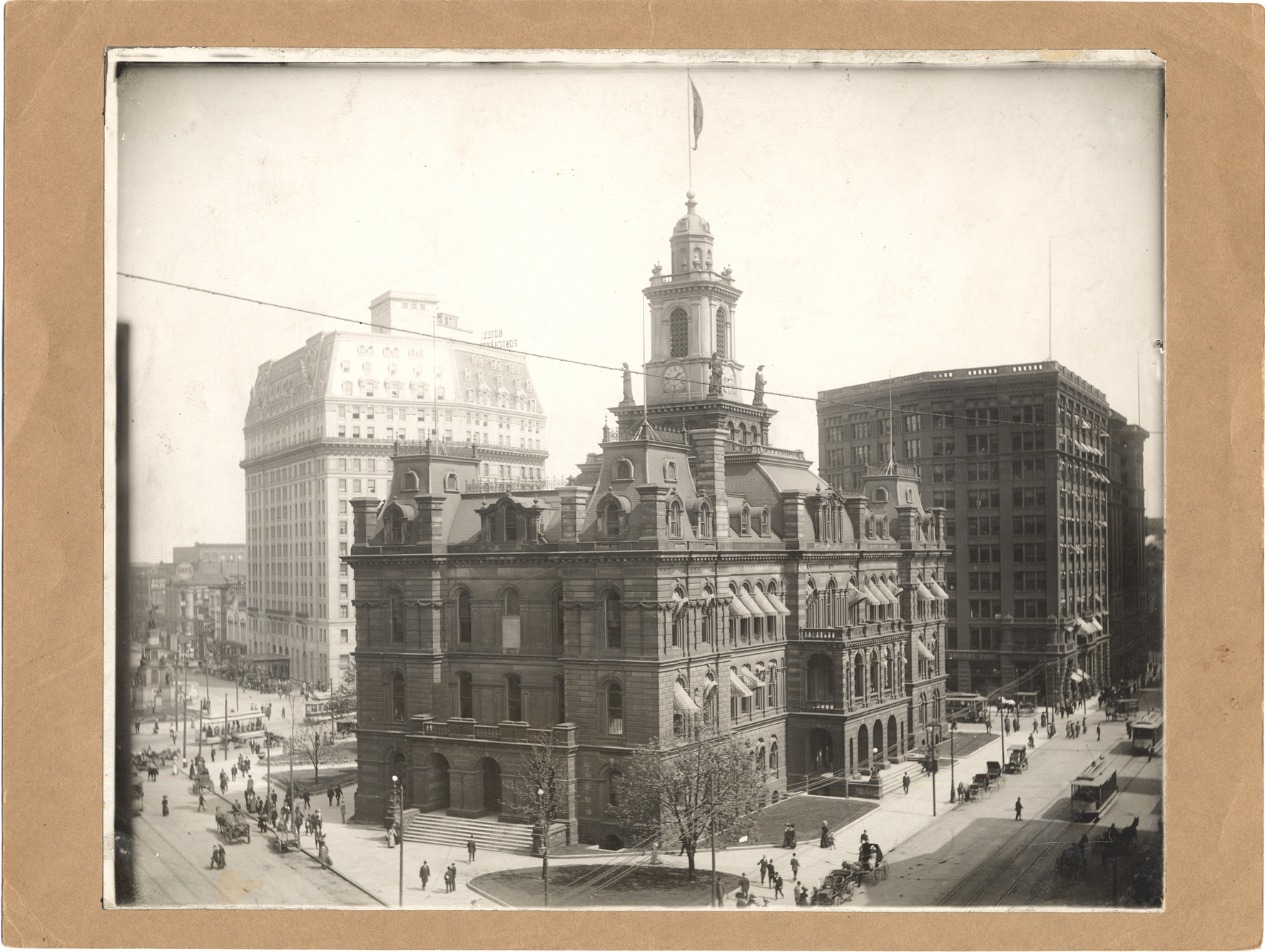 Side view of rear entrance of Detroit City Hall, facing Griswold St. Pontchartrain Hotel in background, Hammond Building on right. Cable cars, horse-drawn vehicles, automobiles, and pedestrians below.