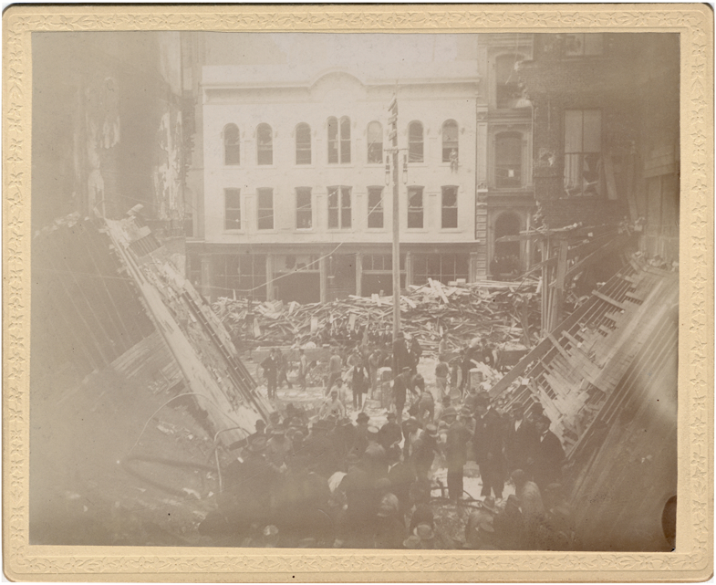 Crowd by collapsed walls with rubble behind. Handwritten on card back: "Journal explosion, Nov. 6/95. 8."