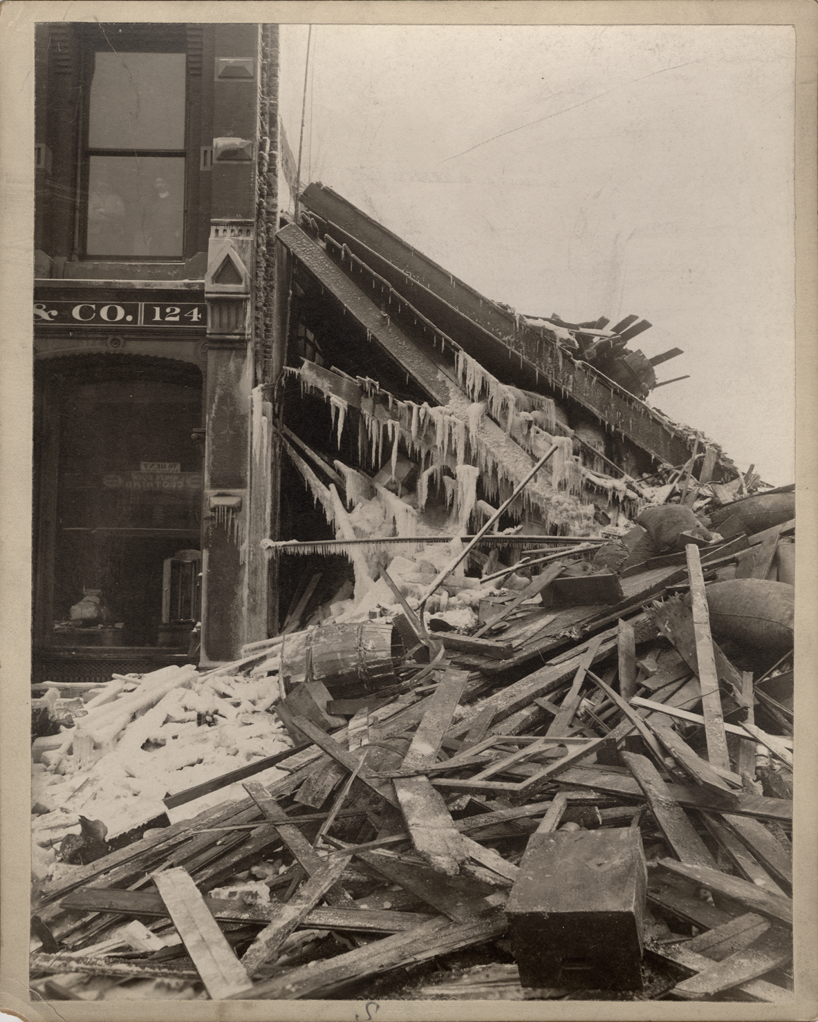 Collapsed floors and wreckage of Crusoe Brothers wholesale grocery building. Building of "[M.M. Stanton] & Co." at 124 next to demolished building. Handwritten on mat front: "S." Handwritten on mat back: "14. Tuesday Jany 21, 1902."