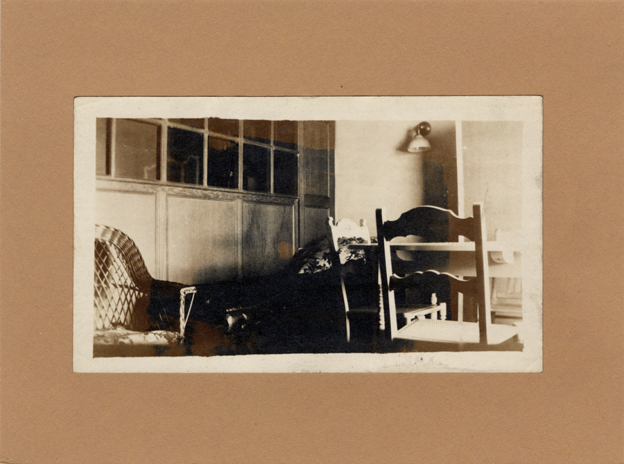 View of a room in the Gray Branch Library, Detroit Public Library, showing table and chairs, wicker chair, chaise, and light fixture on back wall.
