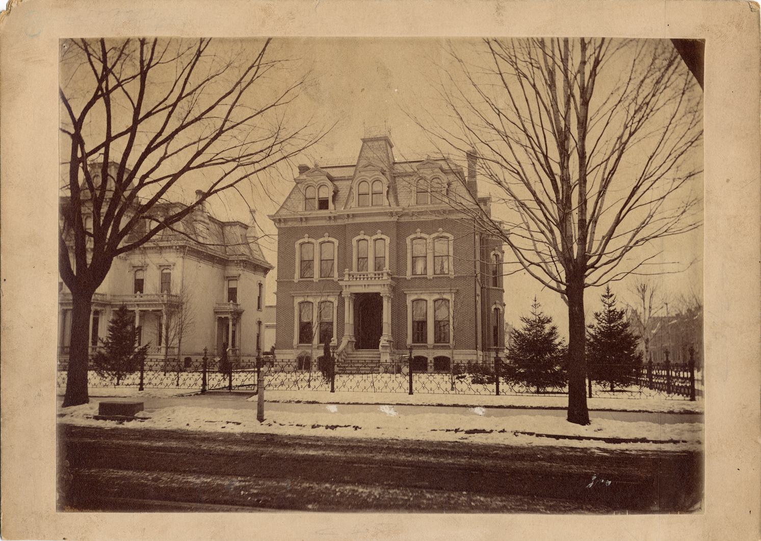 Three-story brick house, mix of Second Empire and Colonial styles. Mansard roof, dormer windows, pillared entrance, surrounded by wrought iron fence. Similar house on right side. Handwritten on back: "Samuel Heavenrich, 468 Woodward Ave., 1881, N.E. corner Alfred & Woodward."