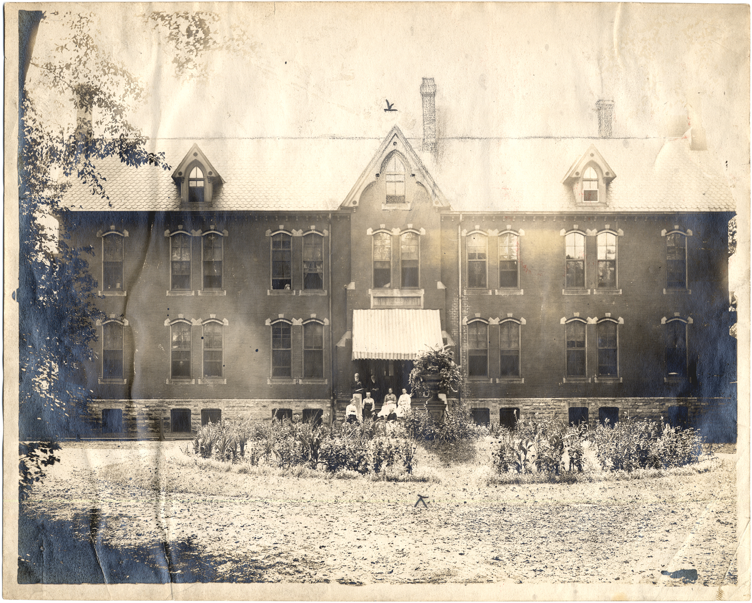View of St. Luke's Hospital; striped awning over front steps; five women and two men seated on front steps; circular garden in front with large urn holding plants. Handwritten on back: "St. Luke's Hospital, first general hospital in Detroit near Fort St."