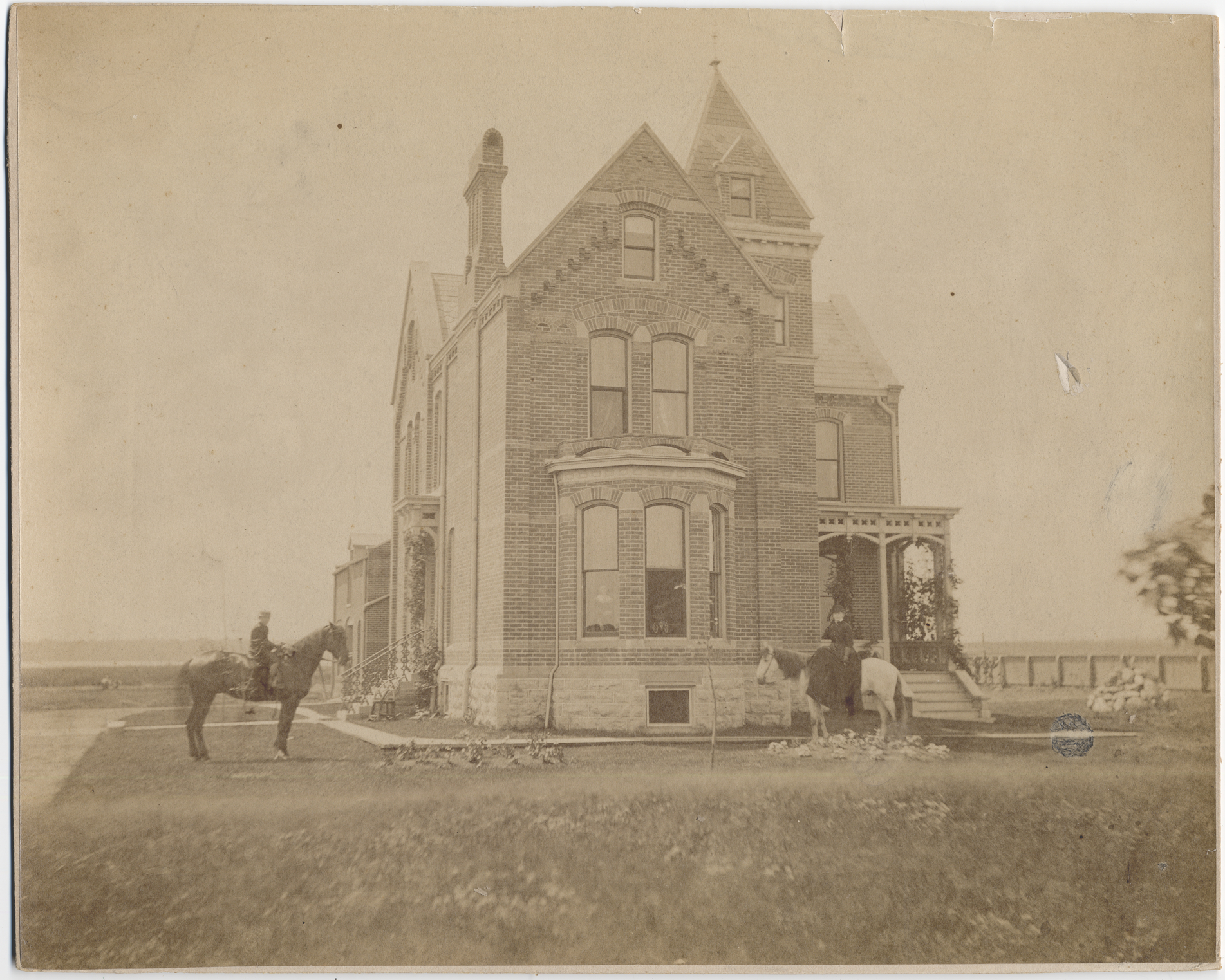 Two-story brick house with decorative brickwork, spired tower, and small front porch. A man and a woman on horses pose in front, another woman can be seen through front window. Rural setting. Residence of S. John Mack.