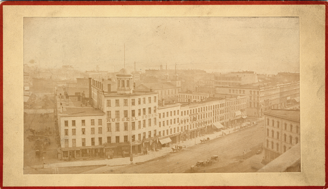 Aerial view of Russell House showing entire city block. Handwritten on back: "East side Woodward Ave. just below Campus Martius, 1871."