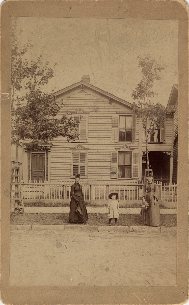 Clapboard house behind picket fence, with two women and a girl standing by stone curb. Woman on left wears dark gown, bonnet, and carries parasol; girl wears sprigged dress and flat hat; other woman wears loose-fitting dress and holds hat. Printed on card back: "Fowler and Slater, photographers' supplies. Amateur outfits from $6 upwards. 208 Superior Street, Cleveland, O." Handwritten on card back: "Fleming, Young, 52 Plum St. (ca. 1890). Ann (?) & Young home, 52 Plum St."